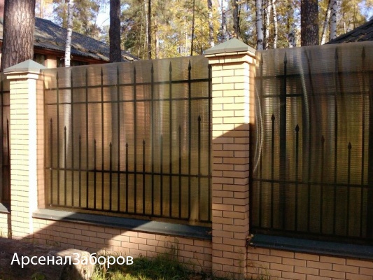 Компания «АрсеналЗаборов» предлагает надежные и долговечные ограждения из поликарбоната для загородного дома и дачного участка. Данный забор не боится осадков, не затеняет участок, имеет эффектный внешний вид. Листы из синтетического полимера прекрасно сочетаются с традиционными строительными материалами, что позволяет воплотить любой дизайнерский замысел. Узнать стоимость забора или оформить заказ Вы можете в режиме онлайн.
